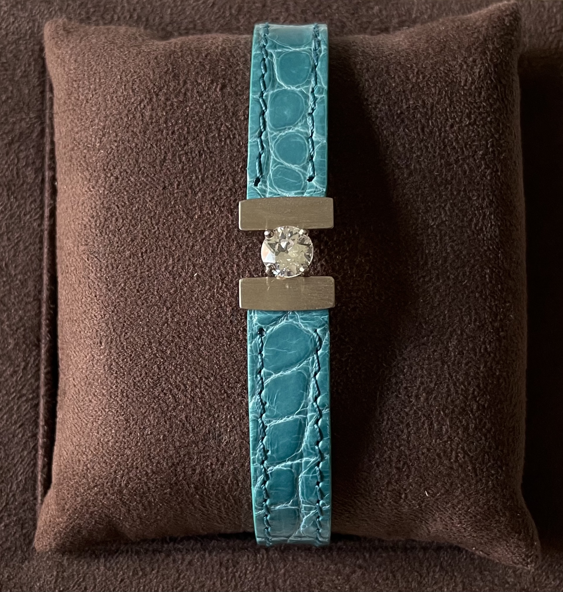 Voici notre bracelet Galamp Powell dans sa déclinaison diamant blanc, or gris 18k et son cuir d’alligator bleu caraïbe.