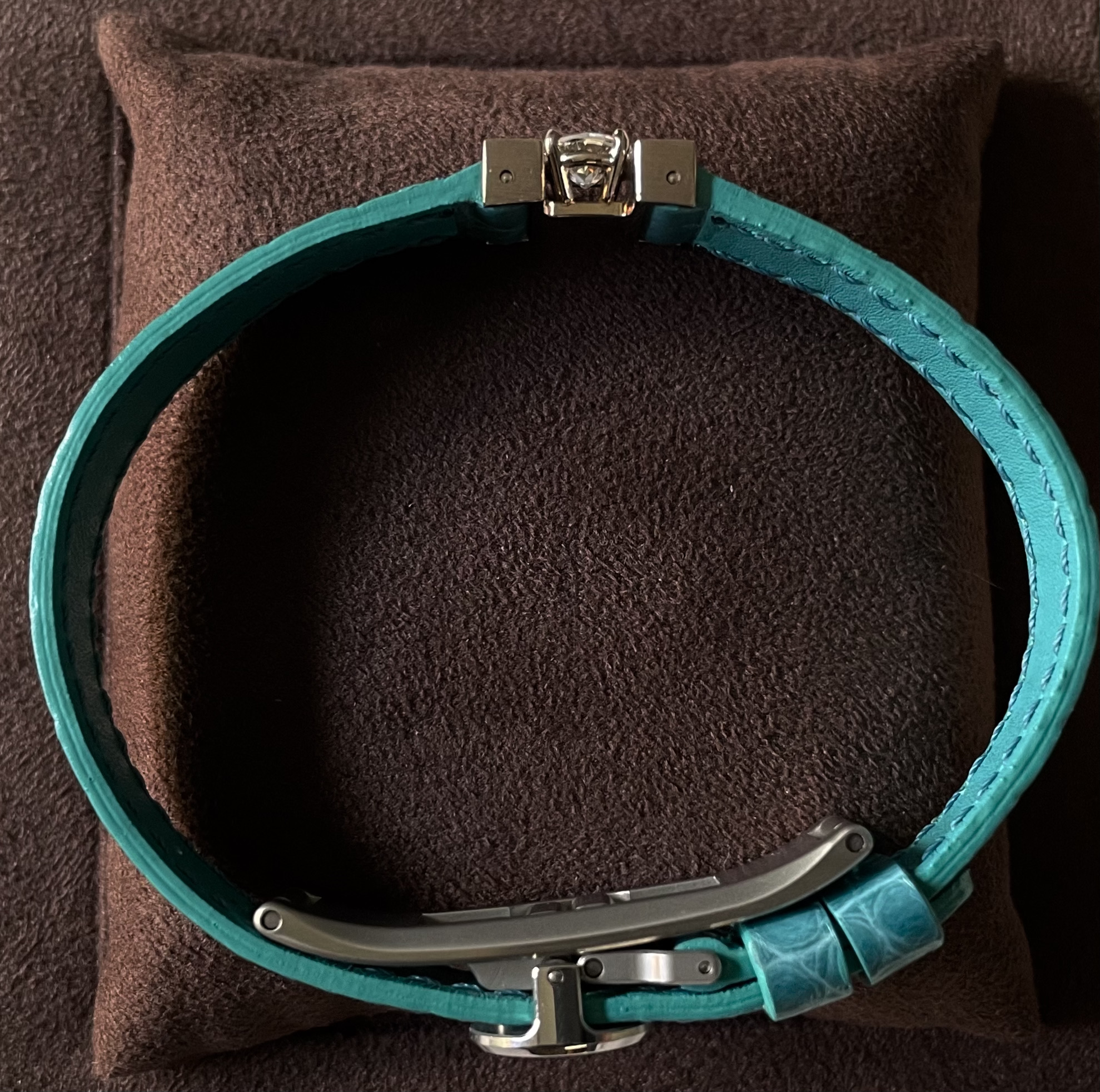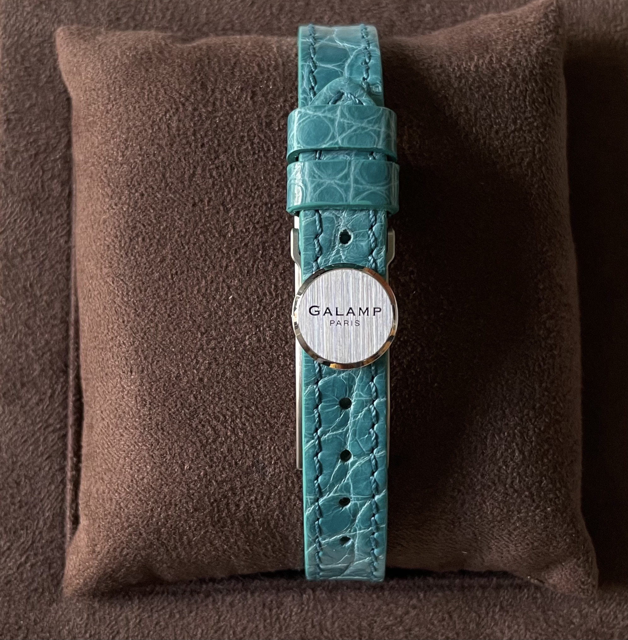 La personnalisation est devenue incontournable aujourd’hui; c’est pourquoi Galamp Paris a prévu un système de barrette afin d’avoir la possibilité de changer au grès des envies, la couleur de votre cuir bleu caraïbe. Nos bracelets sont confectionnés avec le flan d’alligator afin d’avoir un plus bel effet sur les cuirs. Si vous souhaitez un bracelet supplémentaire dès votre première commande contactez-nous